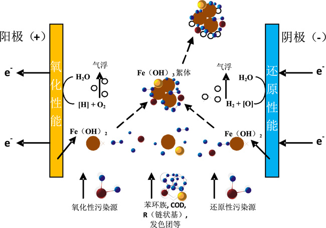 金屬極板受電化學作用,以離子狀態(tài)溶于水中,電解過程中H+大量消耗,OH-逐漸增多,電解液逐漸變?yōu)閴A性,(PH:7-9)并生成穩(wěn)定氫氧化物沉淀。