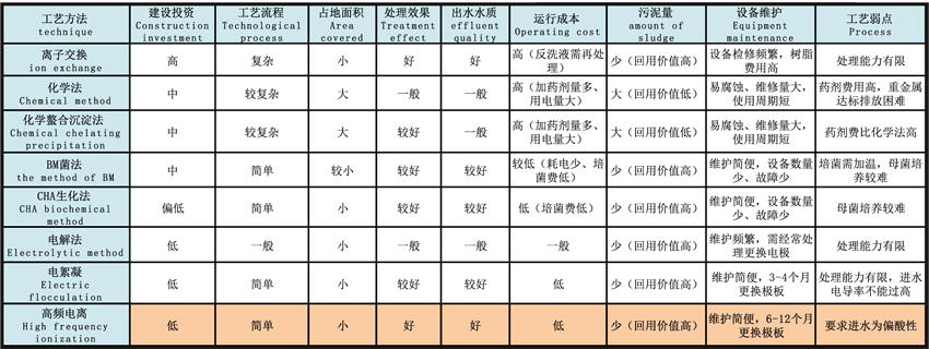 連續(xù)高頻脈沖電離膜處理法產生的氫氧化物比藥劑法的活性高,凝聚吸附能力強, 處理效果好,可達到回用水質標準(化學處理法難以達到)。