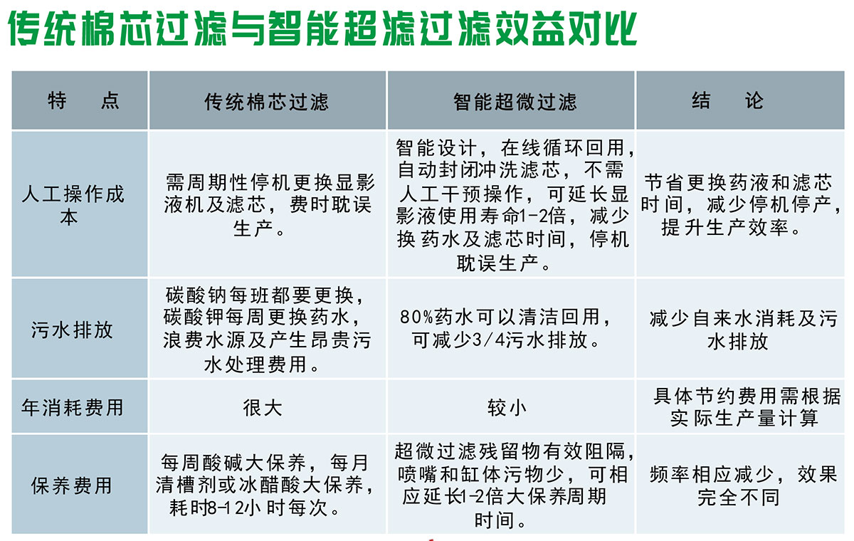而傳統(tǒng)棉芯過濾系統(tǒng),已經(jīng)延用快30年。隨著線路板的高精密飛速發(fā)展,及越來越嚴(yán)的環(huán)保法規(guī),已經(jīng)很難滿足市場發(fā)展需求。使用壽命一般1~2天必須更換,費(fèi)時(shí)費(fèi)力,換下的費(fèi)棉芯屬危廢固體,也越來越高的處理成本。