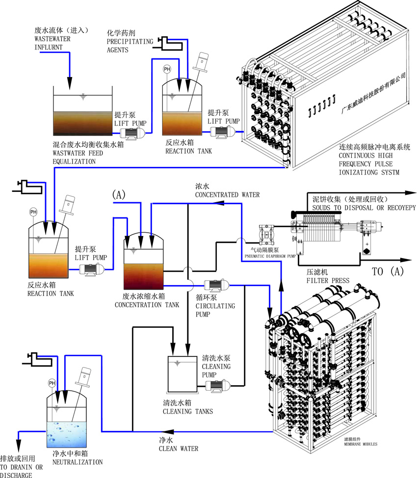 連續(xù)高頻脈沖電離膜處理設(shè)備是當(dāng)今世界最新一代電化學(xué)水處理設(shè)備。連續(xù)高頻脈沖電離膜處理工藝能有效去除水中膠體和懸浮類污染物質(zhì),并對(duì)乳化油、大分子有機(jī)物、微生物、重金屬離子、氟離子、濁度和部分有色類物質(zhì)具有良好的去除效果,因此能廣泛地應(yīng)用于各類廢水治理和給水處理工程。和傳統(tǒng)化學(xué)混凝相比,連續(xù)高頻脈沖電離膜處理工藝具有分離效果好、泥渣含水率低、占地面積小、易于實(shí)現(xiàn)自動(dòng)控制等優(yōu)點(diǎn)。