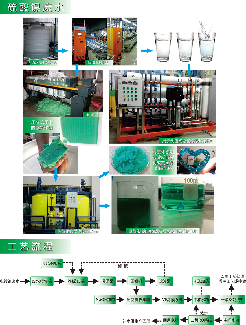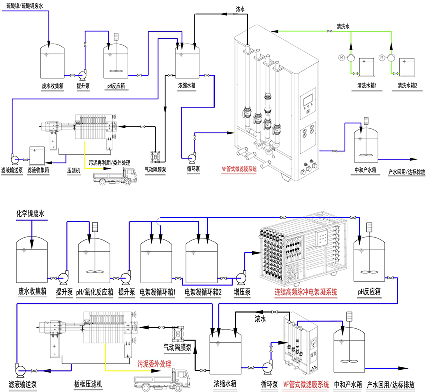 含鎳廢水中的鎳離子屬于一類污染物,必須單獨收集處理,并充分考慮貴重金屬鎳的回收利用。含鎳廢水可分為硫酸鎳廢水和化學(xué)廢水。其中,硫酸鎳廢水經(jīng)過pH調(diào)節(jié)至堿性后直接流入TMF系統(tǒng)處理,金屬鎳最終轉(zhuǎn)化為鎳泥實現(xiàn)資源回收;而化學(xué)鎳廢水單獨收集后,首先經(jīng)過連續(xù)高頻脈沖電離膜系統(tǒng)處理后在流入TMF系統(tǒng)實現(xiàn)固液分離,壓濾得到的鎳泥經(jīng)濟(jì)價值高。