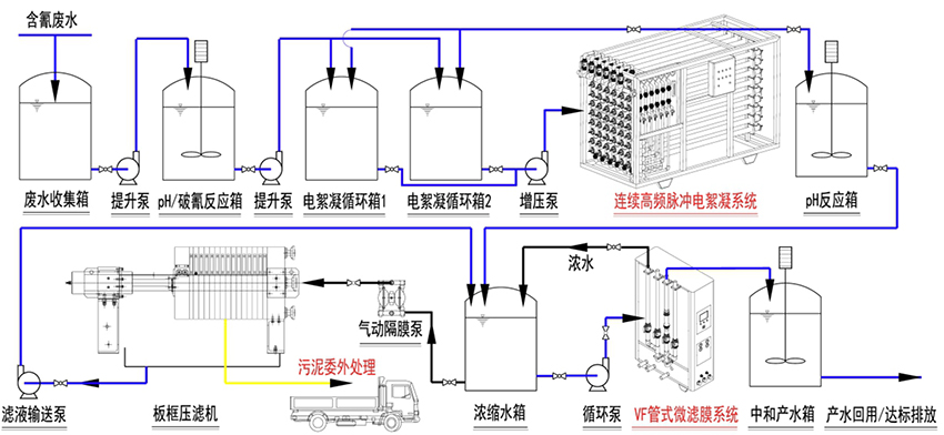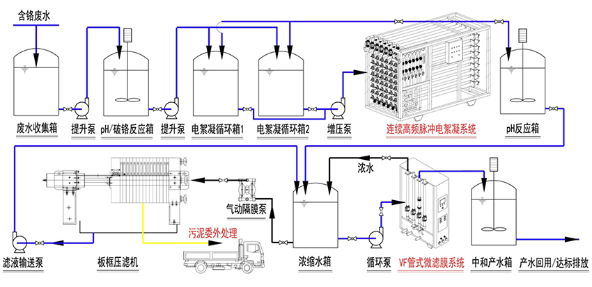 含鉻廢水中的鉻離子屬于一類污染物,必須單獨收集處理,并充分考慮金屬鉻的回收利用。含鉻廢水首先經(jīng)過連續(xù)高頻脈沖電離膜系統(tǒng)處理,將六價鉻還原為三價鉻,并通過pH調(diào)節(jié)箱沉淀,再流入TMF系統(tǒng)實現(xiàn)固液分離,污泥排外處理。
