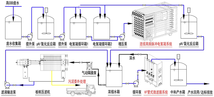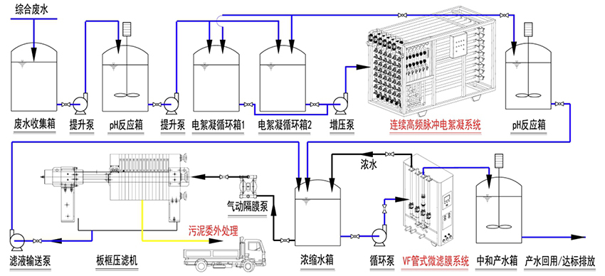 含銅廢水的銅離子屬于一類污染物,必須單獨收集處理,并充分考慮銅的回收利用。含銅廢水可分為普通含銅廢水和絡(luò)合含銅廢水。其中,普通含銅廢水經(jīng)過pH調(diào)節(jié)至堿性后直接流入TMF系統(tǒng)處理,金屬銅可采用離子交換系統(tǒng)實現(xiàn)資源回收;而絡(luò)合銅廢水單獨收集后,首先經(jīng)過高級氧化系統(tǒng)作預(yù)處理,起到了破除銅絡(luò)合的作用,接著進(jìn)入連續(xù)高頻脈沖電離膜系統(tǒng)處理后,再流入TMF系統(tǒng)實現(xiàn)固液分離,壓濾得到的銅泥經(jīng)濟(jì)價值高,可回收利用。