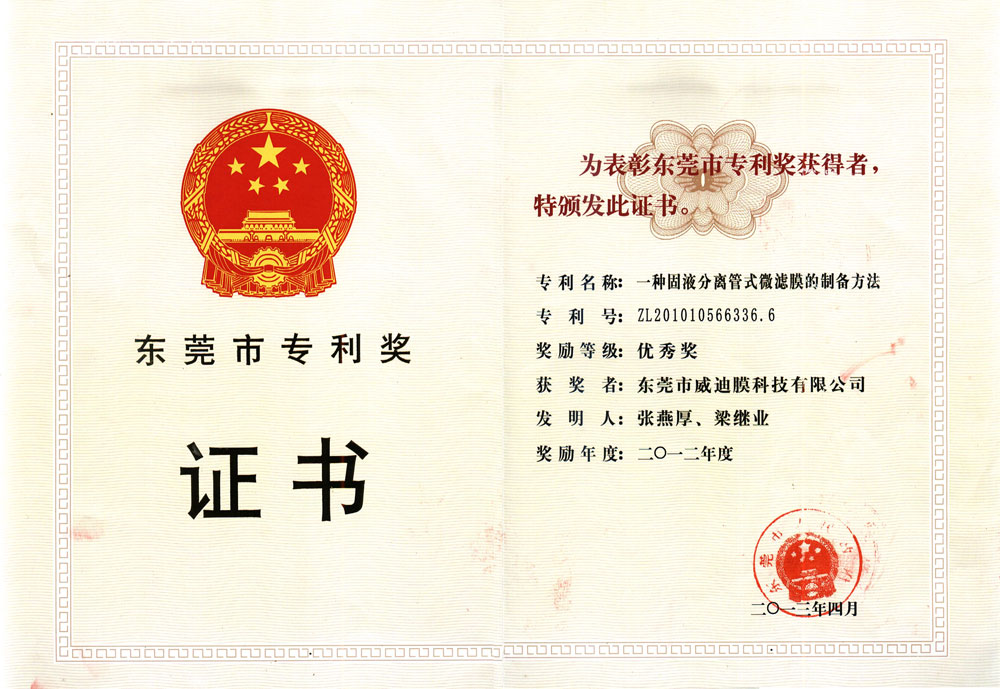 2013年4月,廣東威迪科技股份有限公司的發(fā)明專(zhuān)利“一種固液分離管式微濾膜的制備方法”榮獲由東莞市人民政府頒發(fā)的東莞市專(zhuān)利獎(jiǎng)優(yōu)秀獎(jiǎng)。