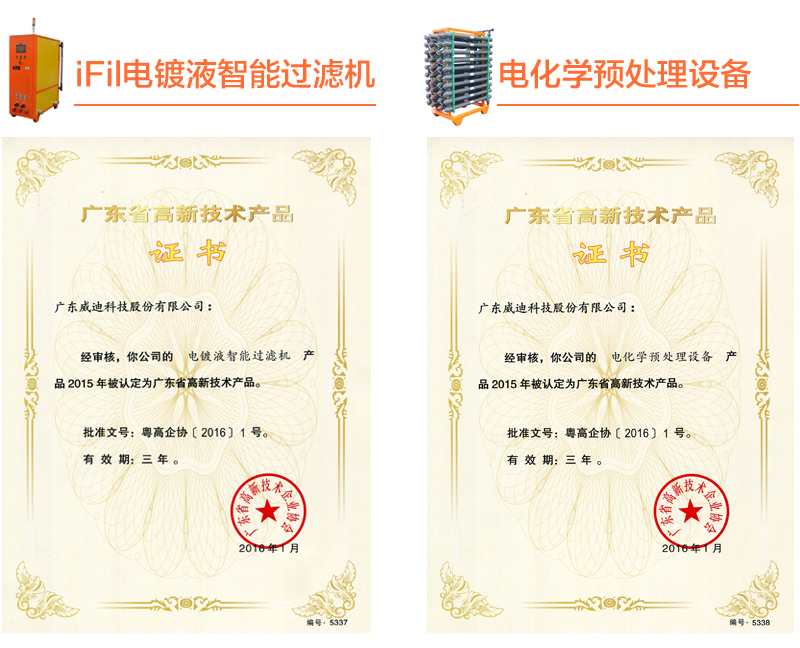 2016年1月,威迪創(chuàng)新產(chǎn)品電鍍液智能過濾機、電化學預處理設備同時獲得了東高新技術(shù)產(chǎn)品認定證書。高新技術(shù)產(chǎn)品認定條件首先需要的是知識產(chǎn)權(quán)歸屬明晰、技術(shù)成熟、市場潛力大,有較好的經(jīng)濟效益、社會效益和環(huán)境效益,符合可持續(xù)發(fā)展的要求,生產(chǎn)過程應符合國家產(chǎn)業(yè)政策、安全和環(huán)境保護的要求。