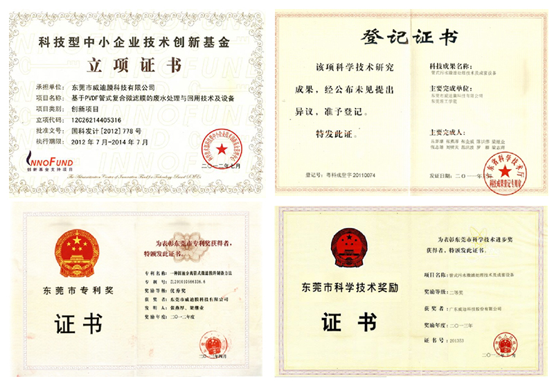 課題組自2006年開始進(jìn)行基于管式微濾膜的污水處理技術(shù)研究與應(yīng)用工作,分別完成了2006年東莞市創(chuàng)新基金項目《管式膜法廢水深度處理技術(shù)與成套設(shè)備》、2011年的東莞市科技型中小企業(yè)技術(shù)創(chuàng)新資金項目(201120110116)和2012年國家科技型中小企業(yè)技術(shù)創(chuàng)新基金無償資助項目(12C26214405316)《基于PVDF管式復(fù)合微濾膜的廢水處理與回用技術(shù)及設(shè)備》以及2013年度東莞市產(chǎn)學(xué)研合作項目《電鍍廢水膜法回用的電化學(xué)預(yù)處理關(guān)鍵技術(shù)研究》(201350910800625),2009年的國家自然科學(xué)基金項目《往復(fù)旋轉(zhuǎn)中空纖維膜剪切強(qiáng)化機(jī)理與滲透特性研究》(20906014)等項目。這期間獲得了19項發(fā)明專利、25項實用新型專利,發(fā)表相關(guān)論文24篇,獲得6項廣東省高新技術(shù)產(chǎn)品,1項東莞市科技進(jìn)步二等獎,1項東莞市專利獎。目前該項目產(chǎn)品已經(jīng)成功應(yīng)用于36個較大型的廢水處理工程中。