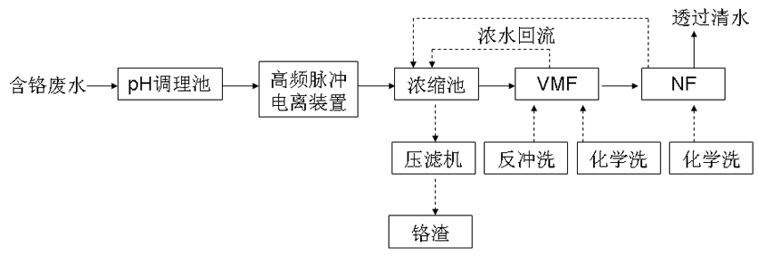 對(duì)于含鉻重金屬?gòu)U水,經(jīng)過(guò)調(diào)節(jié)pH后加入少量藥劑進(jìn)行破絡(luò)合,然后廢水進(jìn)入連續(xù)高頻脈沖電離系統(tǒng),經(jīng)過(guò)處理后的水調(diào)節(jié)pH直接進(jìn)入VMF,然后經(jīng)NF處理之后的產(chǎn)水中鉻含量可達(dá)到0.5mg/L以下,可達(dá)標(biāo)排放至污水處理中心進(jìn)一步生化處理或者直接進(jìn)RO系統(tǒng)進(jìn)行回用處理,以滿足企業(yè)60%回用的要求;污泥被壓渣后交具資質(zhì)的公司處理。系統(tǒng)中電離采用鐵陰極、炭纖維陽(yáng)極,電離反應(yīng)器中填充金屬泡沫,反應(yīng)時(shí)間30min;VMF帶自動(dòng)反沖洗系統(tǒng),每運(yùn)行約20-30分鐘自動(dòng)反沖洗15s左右,當(dāng)TMF膜的通量衰減到300L/m2h則自動(dòng)進(jìn)行化學(xué)清洗,根據(jù)運(yùn)行效果,大約每15天進(jìn)行化學(xué)清洗一次。當(dāng)NF污染到一定程度,則自動(dòng)進(jìn)行化學(xué)清洗,運(yùn)行中大約2-6月需化學(xué)清洗一次。