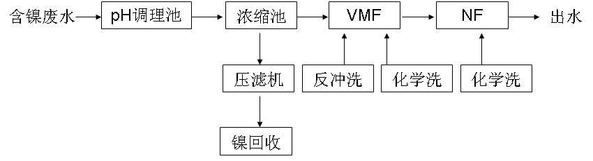 對(duì)于含酸鎳重金屬?gòu)U水,首先將廢水調(diào)節(jié)至pH 11~11.5,然后直接進(jìn)入VMF膜分離,以切向流過(guò)濾的形式其VMF濃水回流至濃縮池,而濃縮池內(nèi)水連接壓濾機(jī),將其中的鎳沉淀物直接壓成鎳渣進(jìn)行回收;而VMF透過(guò)液則進(jìn)入NF裝置,進(jìn)一步過(guò)濾其中的鎳離子,可達(dá)標(biāo)排放至污水處理中心進(jìn)一步生化處理;也可以直接回用普通的清洗或配套R(shí)O生產(chǎn)純水,以滿足企業(yè)60%回用的要求。鎳金屬可直接壓渣后加硫酸溶解后(硫酸鎳)回用或交具資質(zhì)的公司處理。TMF與NF組合工藝中TMF帶自動(dòng)反沖洗系統(tǒng),每運(yùn)行約20分鐘自動(dòng)反沖洗10s左右,當(dāng)TMF膜的能量衰減到300L/m2h則自動(dòng)進(jìn)行化學(xué)清洗,根據(jù)運(yùn)行效果,大約每15-20d進(jìn)行化學(xué)清洗一次。當(dāng)NF污染到一定程度,則自動(dòng)進(jìn)行化學(xué)清洗,運(yùn)行中大約2月需化學(xué)清洗一次。