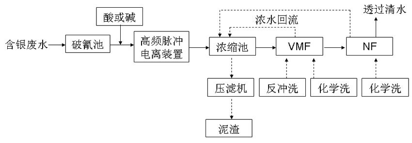 含銀廢水, 經(jīng)過(guò)調(diào)整pH后加入少量藥劑進(jìn)行破氰,再調(diào)節(jié)pH進(jìn)入連續(xù)高頻脈沖電離系統(tǒng),經(jīng)過(guò)處理后的水調(diào)節(jié)pH直接進(jìn)入TMF(固液分離膜系統(tǒng)),產(chǎn)水即可達(dá)標(biāo)排放至污水處理中心,也可以直接回用普通的清洗或配套R(shí)O生產(chǎn)純水,以滿足企業(yè)60%回用的要求。污泥被壓渣后交具資質(zhì)的公司處理。系統(tǒng)中電離采用鐵陰極、炭纖維陽(yáng)極,電離反應(yīng)器中填充金屬泡沫,反應(yīng)時(shí)間30min;VMF帶自動(dòng)反沖洗系統(tǒng),每運(yùn)行約20-30分鐘自動(dòng)反沖洗15s左右,當(dāng)TMF膜的通量衰減到300L/m2h則自動(dòng)進(jìn)行化學(xué)清洗,根據(jù)運(yùn)行效果,大約每15天進(jìn)行化學(xué)清洗一次。當(dāng)NF污染到一定程度,則自動(dòng)進(jìn)行化學(xué)清洗,運(yùn)行中大約2-6月需化學(xué)清洗一次。