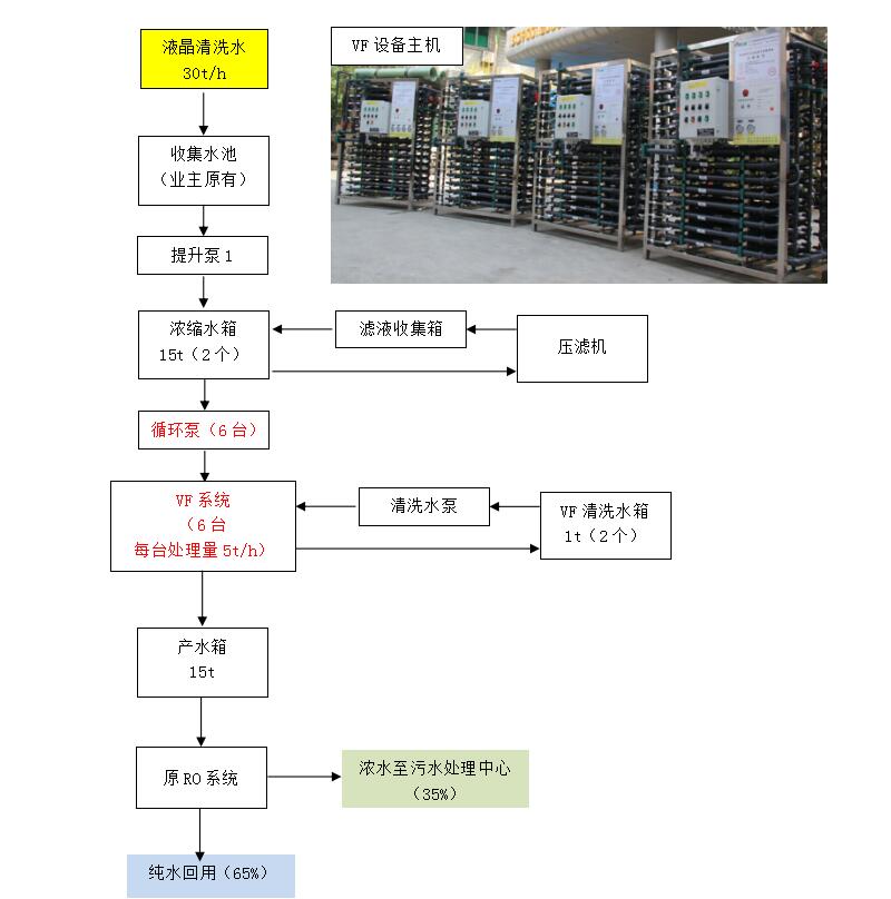 該液晶清洗水中含有少量的懸浮物質(zhì),設(shè)計(jì)采用VF膜過濾處理工藝。該廢水直接進(jìn)入VF系統(tǒng),經(jīng)過膜過濾后的產(chǎn)水符合RO系統(tǒng)的進(jìn)水要求。原水過濾后剩余的濃縮廢水經(jīng)板框壓濾機(jī)脫水后形成的干泥餅送往廢物處理中心處理,濾液和系統(tǒng)清洗液返回收集水箱進(jìn)行再處理。