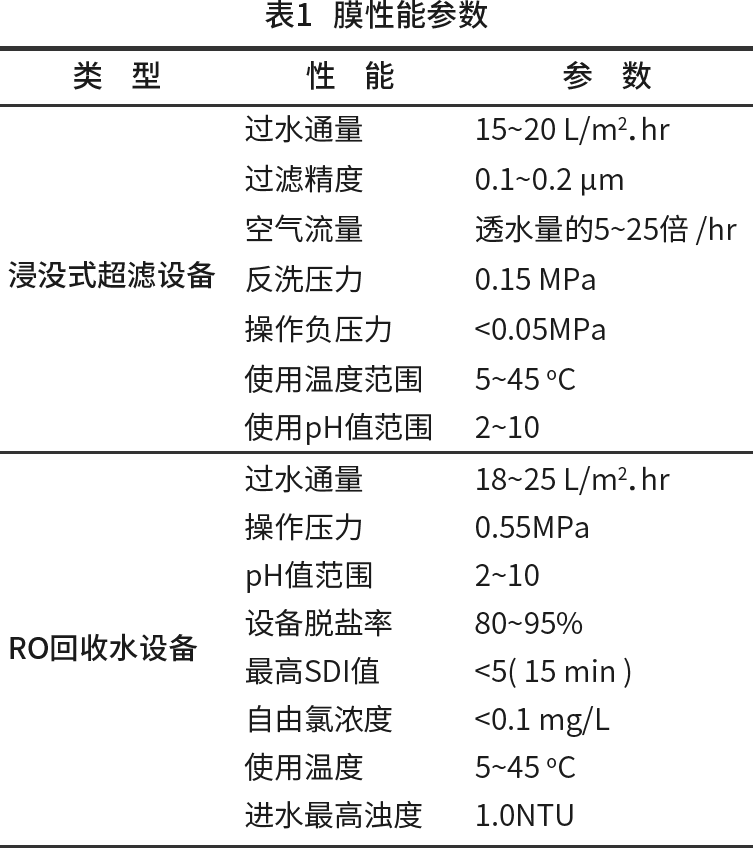 某印染公司的印染廢水中水回用工程由2個(gè)系統(tǒng)組成:一是新建了20000 m3/d的物化、生化處理系統(tǒng),使印染廢水COD濃度降到100~200 mg/L;二是配套建成了8000m3/d廢水深度處理的膜處理系統(tǒng),利用“雙膜法”技術(shù)再對印染廢水進(jìn)行深度處理之后,全部回用于生產(chǎn)中,本工程采用的膜性能參數(shù)詳見表1。該工程處理污水量20000 m3/d,其中回用8000 m3/d,占地面積20000m2,建筑面積3000m2。