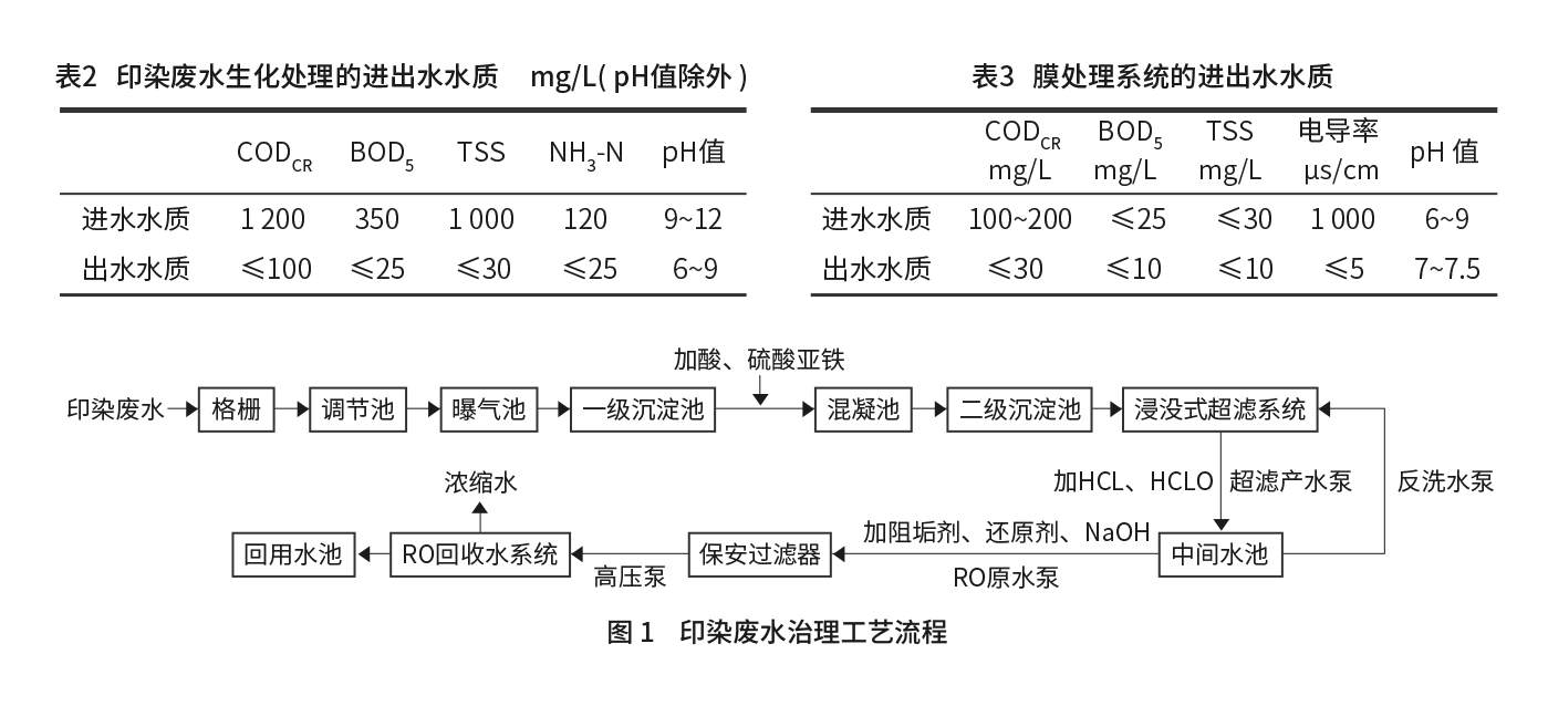 針對印染廢水屬于典型的工業(yè)有機(jī)廢水這一特性和可生化性較差并含有難以降解的水溶性有機(jī)污染物、SS、膠體狀物質(zhì)等特點(diǎn),采用了“雙膜法”處理工藝,不僅可以回收水資源,實(shí)現(xiàn)廢水循環(huán)回用,而且還可以進(jìn)一步削減排污總量。