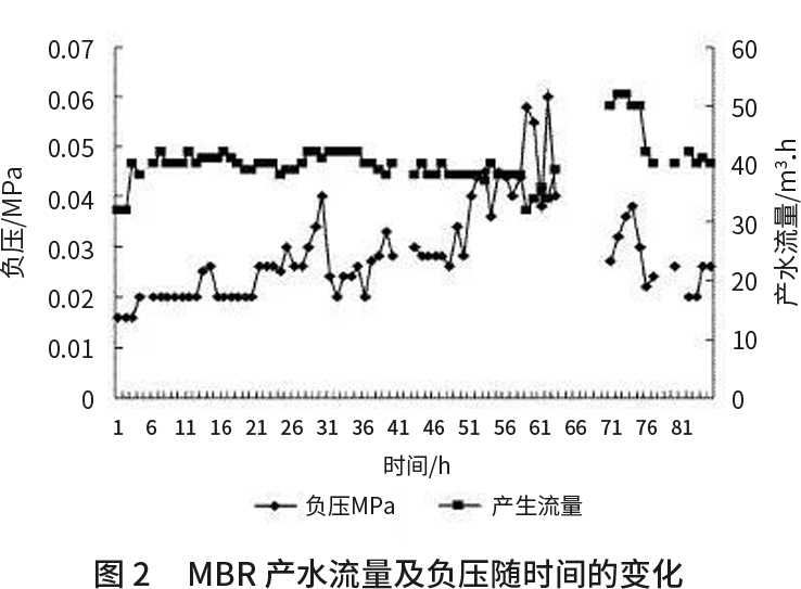 圖2為MBR膜產(chǎn)水通量與操作壓力之間的關(guān)系圖,可以看出,MBR膜的產(chǎn)水通量隨著膜負(fù)壓的升高呈較為平緩的下降。隨著壓力增加,膜污染加劇,通量不再隨壓力增加而線性增加,而是逐漸趨向平緩。這可能是由于壓力越大,污染層被壓密,導(dǎo)致膜污染阻力增加而引起的。