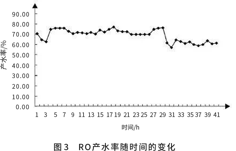 與傳統(tǒng)的生物處理方法和超濾技術(shù)相比,MBR具有生化效率高、抗負(fù)荷沖擊能力強(qiáng)、出水水質(zhì)穩(wěn)定、占地面積小、排泥周期長、易實(shí)現(xiàn)自動(dòng)控制等優(yōu)點(diǎn),是目前最有前途的廢水處理新技術(shù)之一。由圖3可以看出,RO膜的產(chǎn)水率隨著運(yùn)行時(shí)間的增加呈較為平緩的下降。