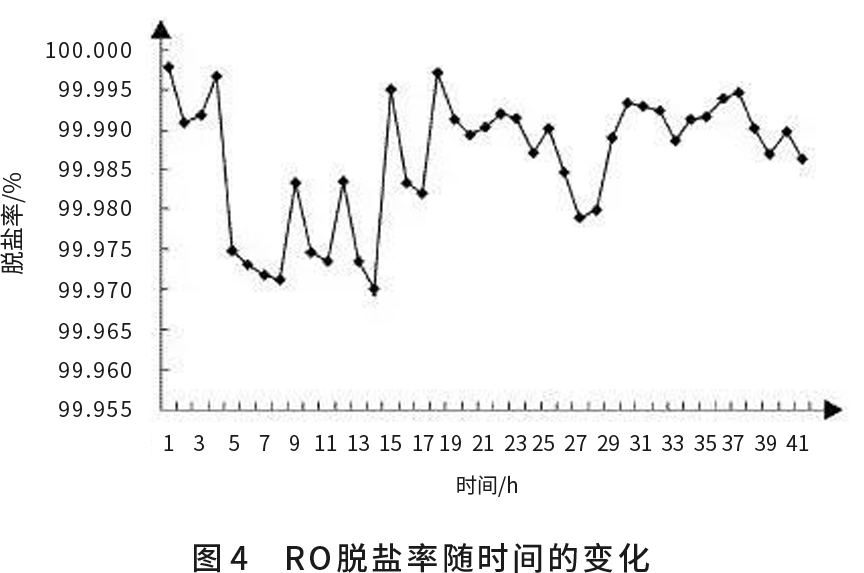 圖4為RO脫鹽率隨時(shí)間之間的關(guān)系圖,可以看出,RO膜的脫鹽率很高,基本在99。96%以上。原水中溶解性雜質(zhì)透過膜的百分率,計(jì)算公式為:SP=100%×(Cp/Cfm)(1)