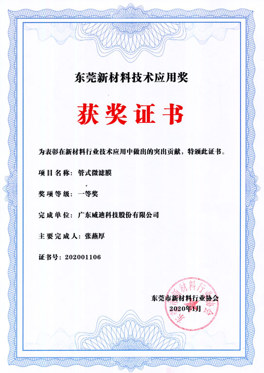 本次活動是由清華東莞創(chuàng)新中心、東莞理工學(xué)院科技處主辦,東莞市新材料行業(yè)協(xié)會承辦,廣東清大孵化器有限公司協(xié)辦。會上表彰了在新材料行業(yè)技術(shù)創(chuàng)新、應(yīng)用、服務(wù)做出的突出貢獻(xiàn)的單位及個人。由廣東威迪科技股份有限公司申報的《管式微濾膜》項(xiàng)目榮獲東莞新材料技術(shù)應(yīng)用獎(項(xiàng)目類)一等獎。
