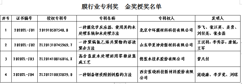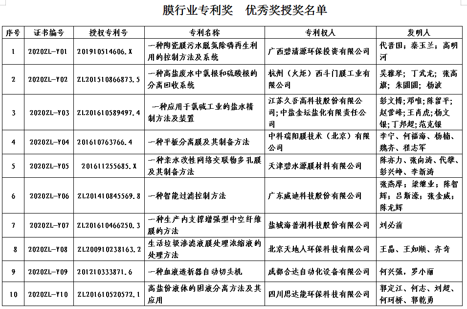 根據(jù)《膜行業(yè)專利獎獎勵辦法》的規(guī)定,經中國膜工業(yè)協(xié)會組織有關專家評審,決定授予“一種膜化學反應器、使用其的水處理系統(tǒng)和水處理方法”等4項發(fā)明專利金獎;授予“一種陶瓷膜污水脫氮除磷再生利用的控制方法及系統(tǒng)”等10項發(fā)明專利優(yōu)秀獎。