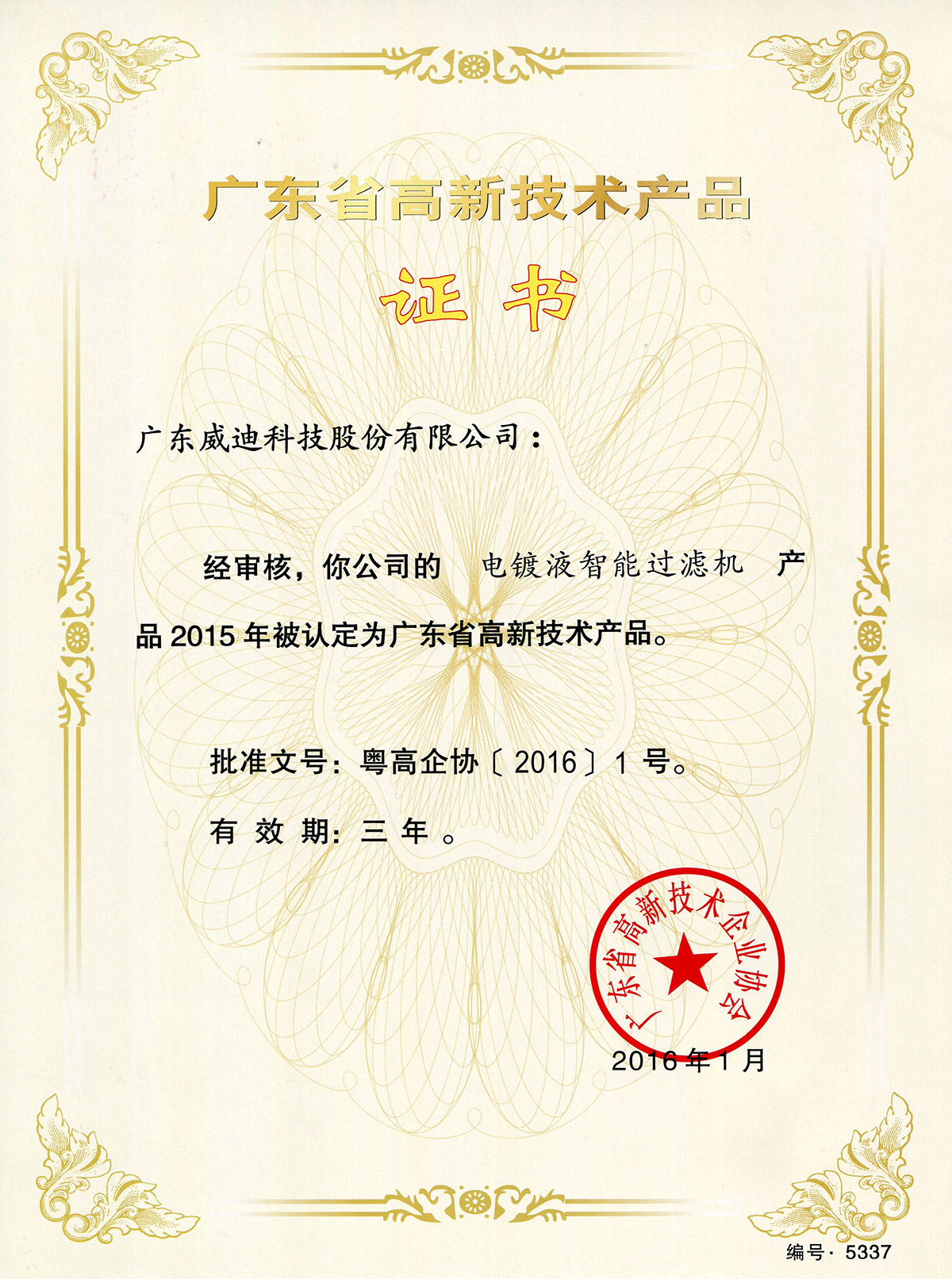 2015年廣東省高新技術產(chǎn)品-電鍍液智能過濾機
