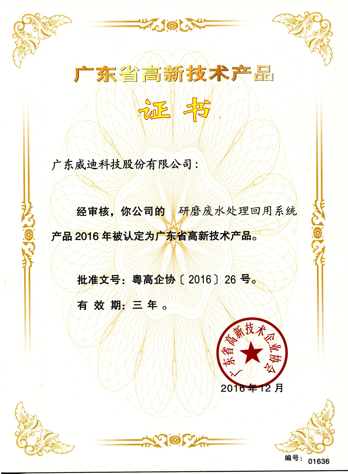 2016年廣東省高新技術(shù)產(chǎn)品-研磨廢水處理回用系統(tǒng)