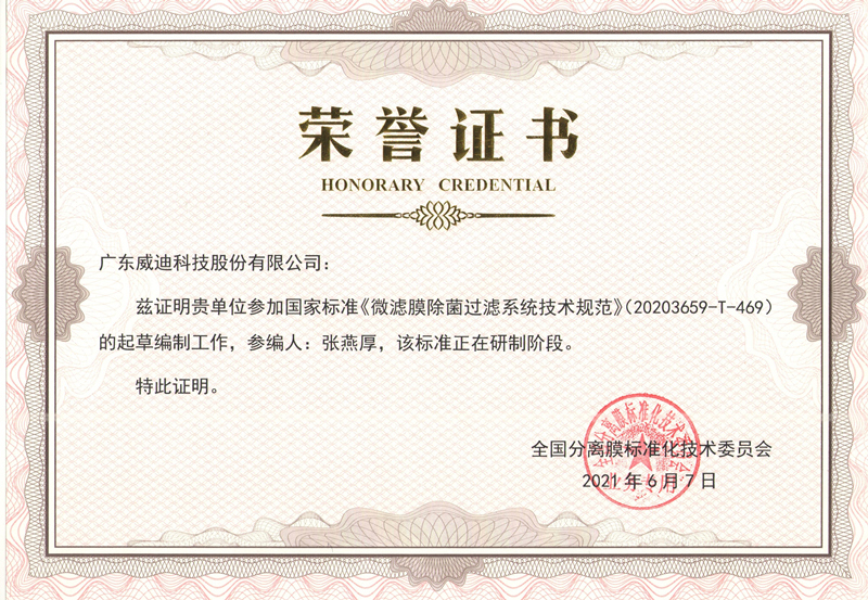 威迪股份受邀作為參編單位參與國家標(biāo)準(zhǔn)計(jì)劃《微濾膜除菌過濾系統(tǒng)技術(shù)規(guī)范》的起草;該標(biāo)準(zhǔn)由TC382(全國分離膜標(biāo)準(zhǔn)化技術(shù)委員會(huì))歸口上報(bào)及執(zhí)行,主管部門為國家標(biāo)準(zhǔn)化管理委員會(huì)。擬實(shí)施日期:發(fā)布后個(gè)月正式實(shí)施。