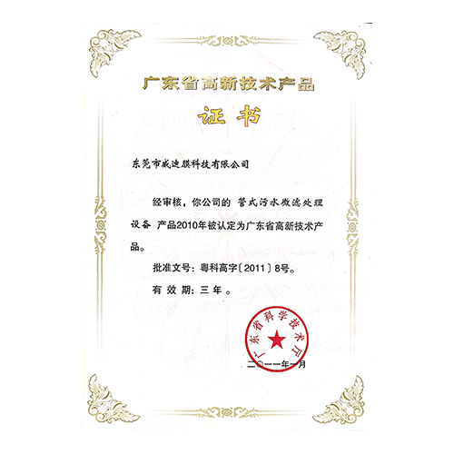 2011年廣東省高新技術(shù)產(chǎn)品-管式污水微濾處理設備